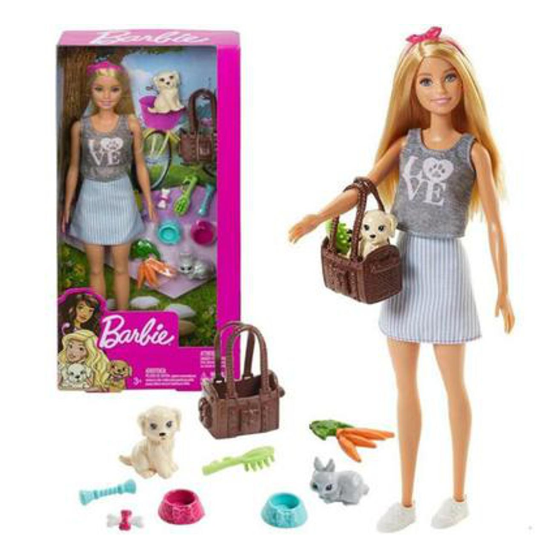 • Barbie wears a trendy, comfortable outfit suitable for pet playtime.