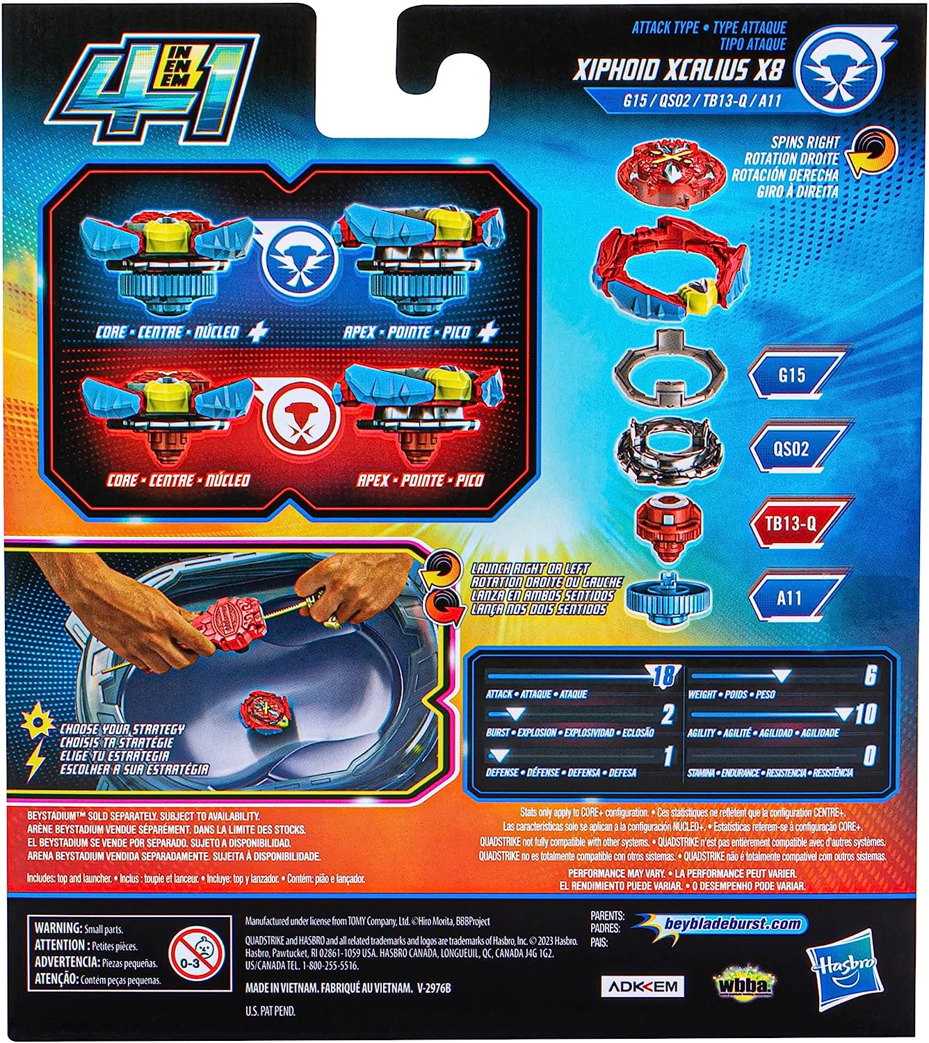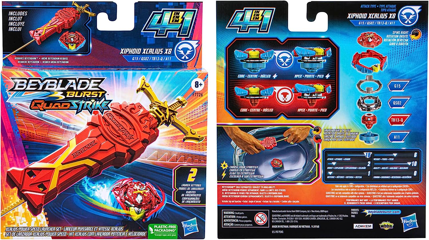 Includes right-spin Beyblade Burst QuadStrike Xiphoid Xcalius X8 G15 QS02 TB13-Q A11 top. Customize top to Core and Apex mode for balance type or to Core+ and Apex+ mode for attack type