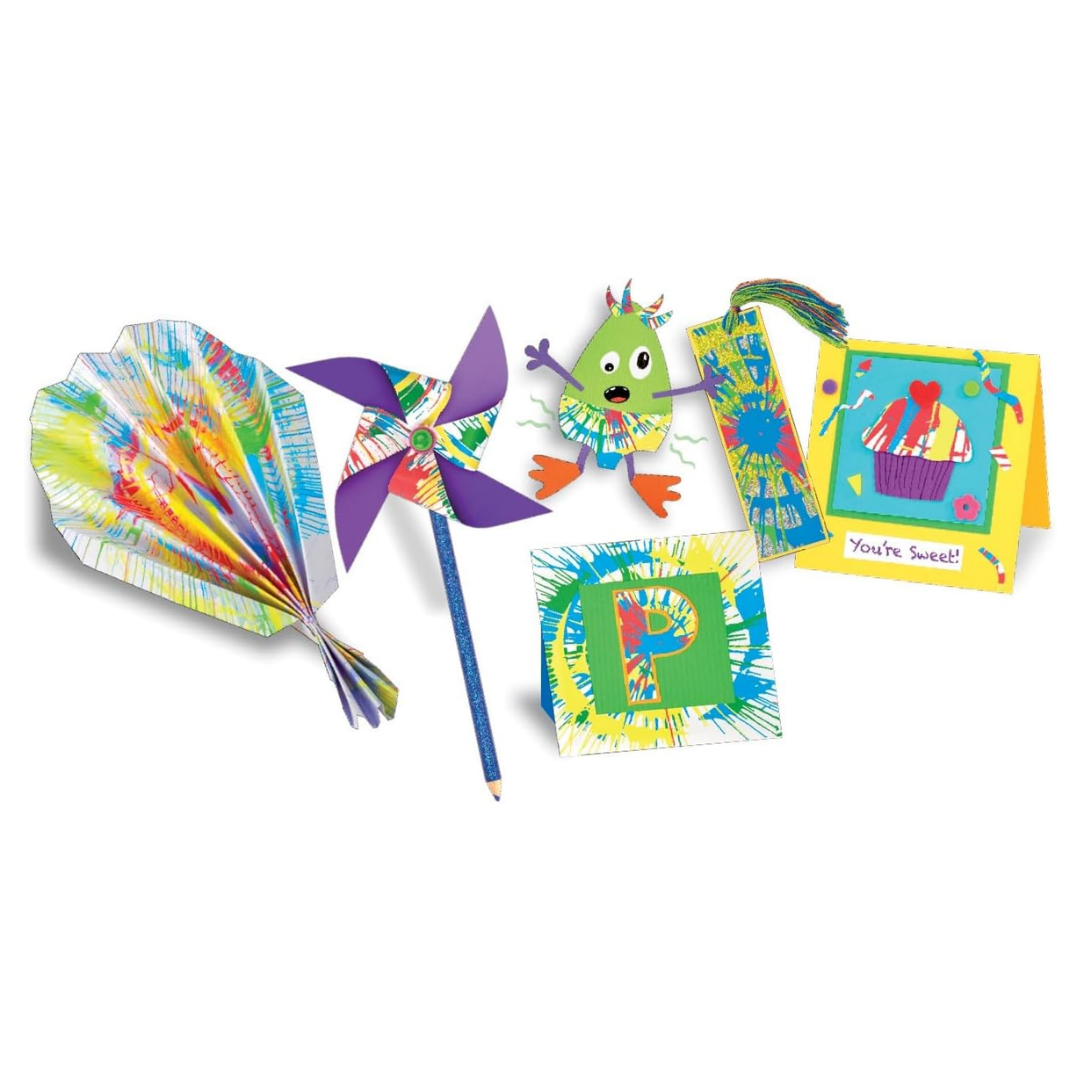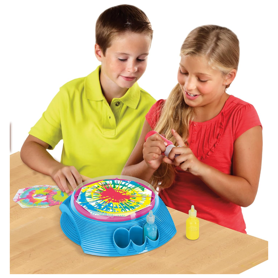- Squeeze drops of paint on the spinning wheel to create crazy patterns
