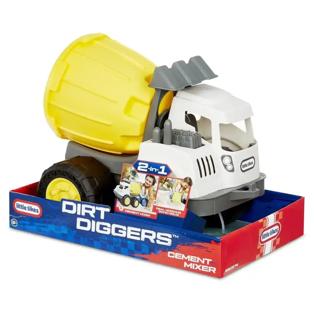 The Dirt Diggers 2-in-1 Cement Mixer is a plastic construction vehicle that can be used for indoor and outdoor play. This fun toy truck features a removable cement bucket for hours of fun! Encourages active, imaginative play in kids while improving their fine motor skills.