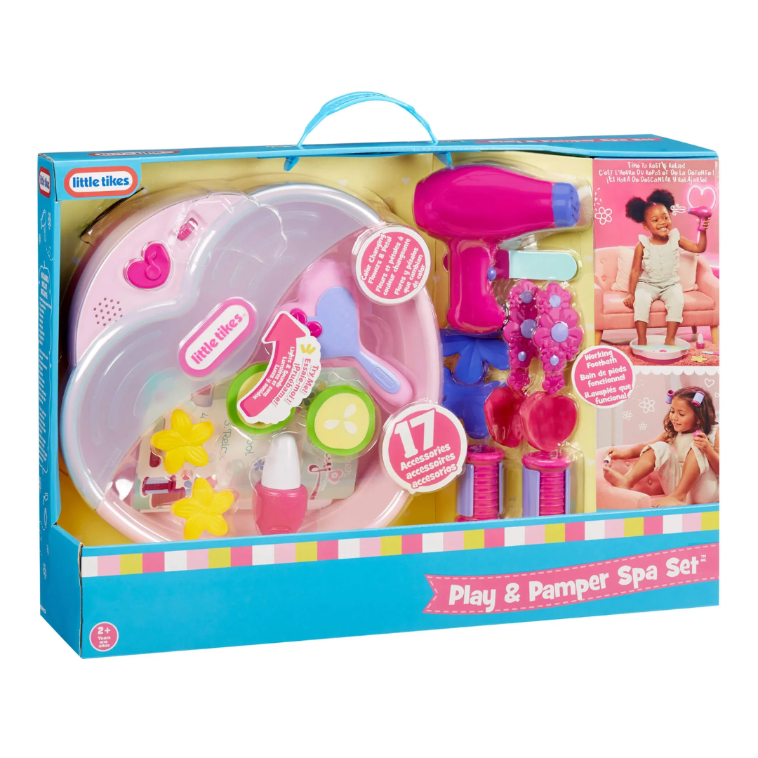 - 17 BEAUTY ACCESSORIES – This role play set includes a working footbath, 6 color changing flowers and petals, 2 pretend cucumber slices, 2 hair rollers, 2 barrettes, hair brush, hair dryer, mess-free nail polish, play nail file and a spa menu card.