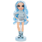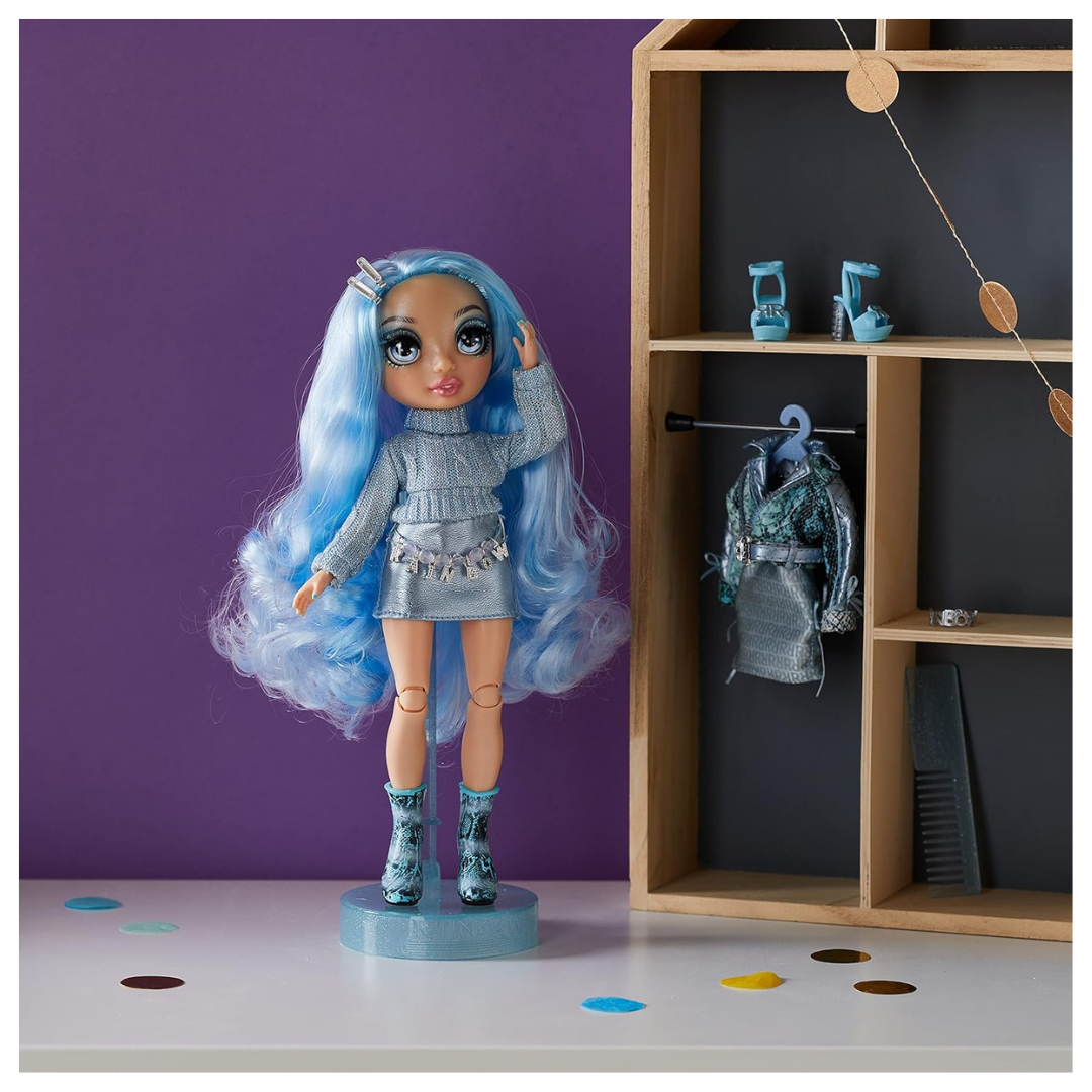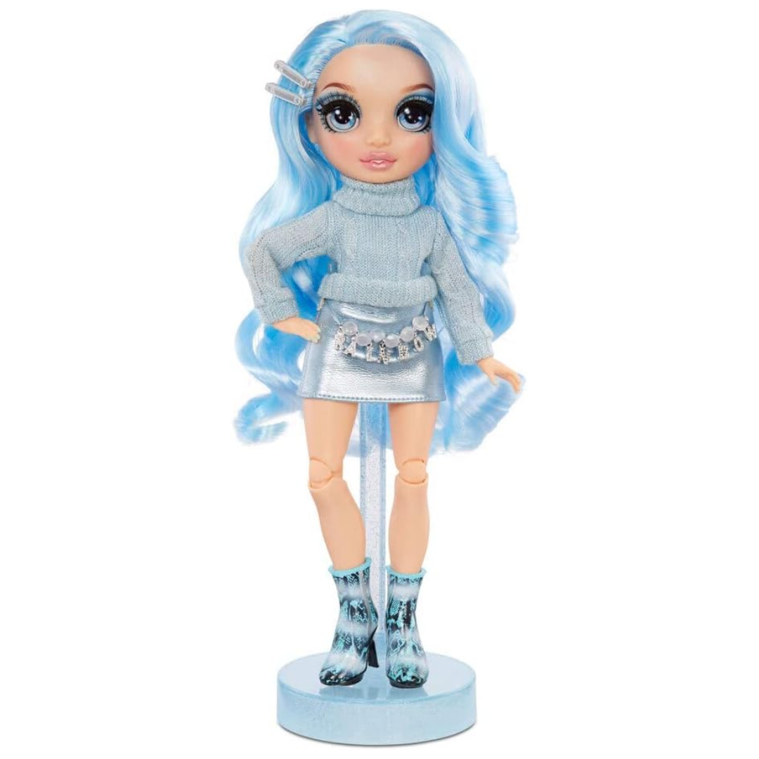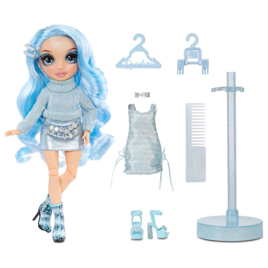 This 11″ (27 cm) articulated fashion doll is decked in icy-blue hair